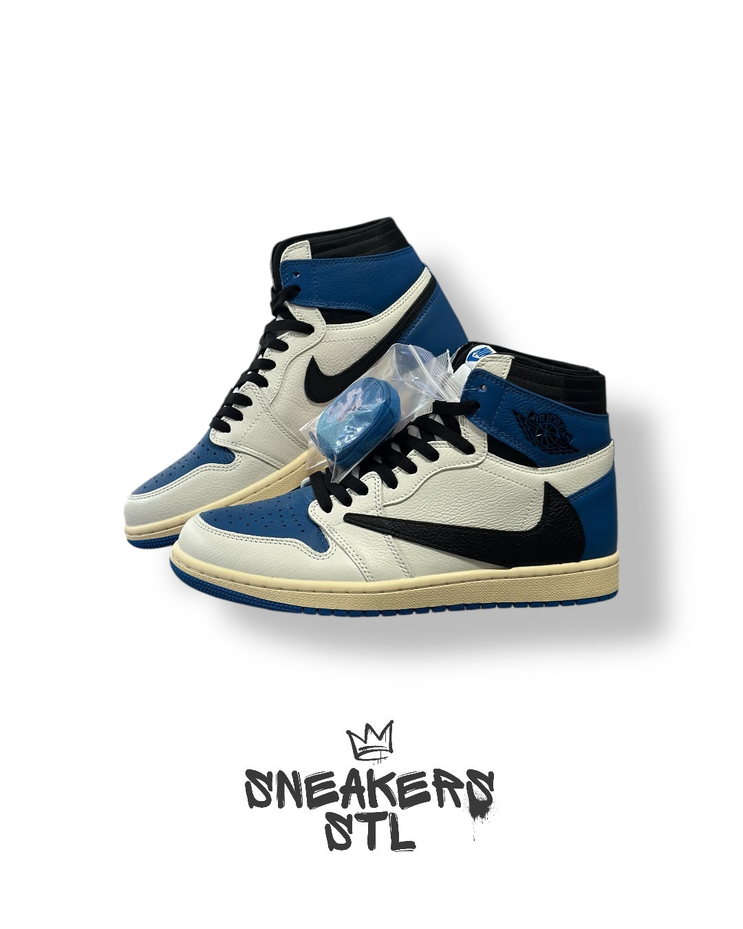 Jordan 1 High calidad PK, esta es la colaboración exitosa entre Fragment, Travis Scott y Jordan nos entregan este Jordan 1 High en tonos azul con blanco.