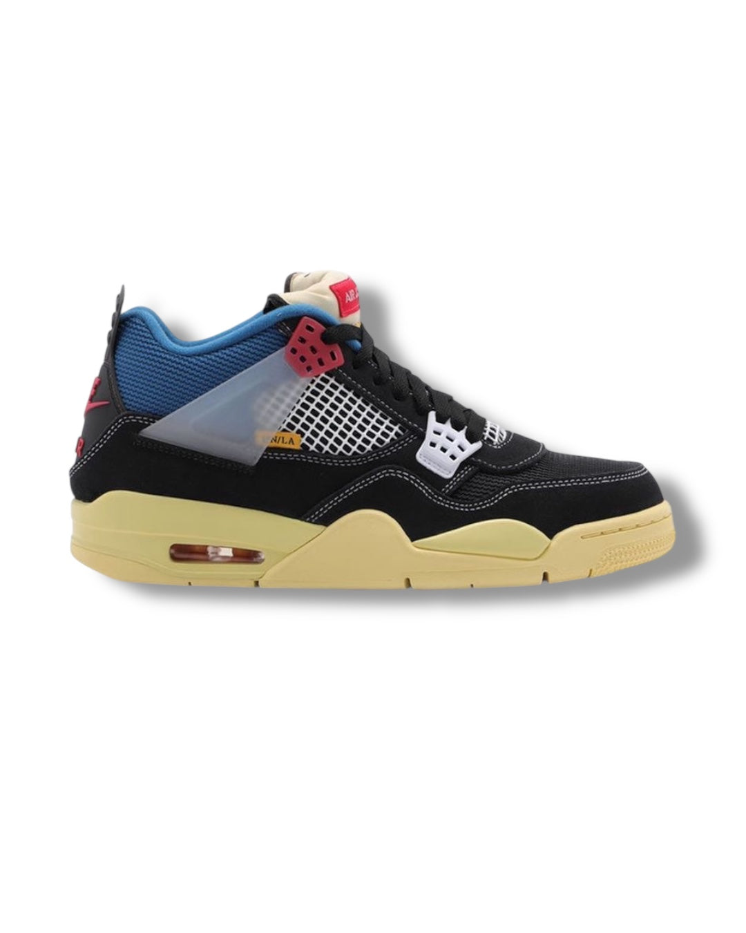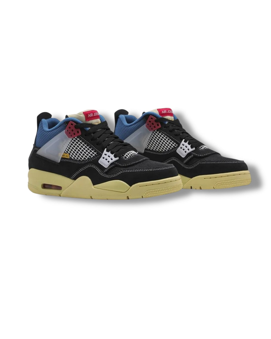 Jordan 4 calidad PK, esta es una colaboración entre Jordan X UNION, tenemos un par con los colores azul, negro, blanco y rojo los materiales son malla y gamuza.